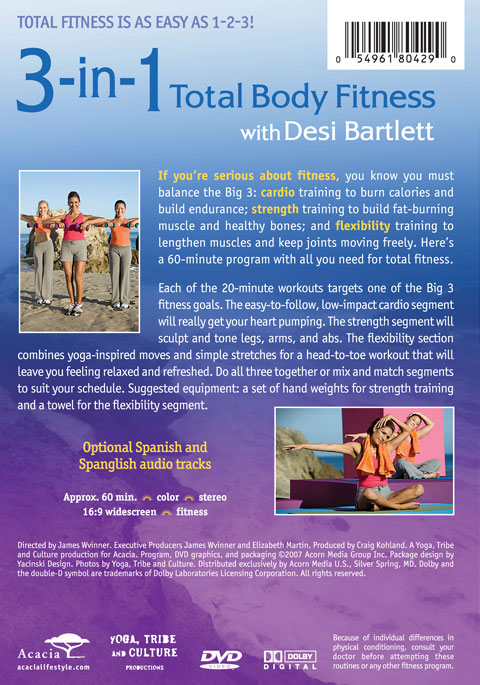 | 3 en 1 Acondicionamiento Total del Cuerpo Con mucha energia, la instructora Desi Bartlett ofrece una rutina de ejercicios de cuerpo completo estilo triatlon, con tres segmentos de 20 minutos cada uno: uno con ejercicio cardiovascular, uno para fortalecimiento muscular, y uno para flexibilidad. Opciones de audio para escuchar en espanol y en "Spanglish." Aproximadamente 60 minutos en un (1) DVD. |