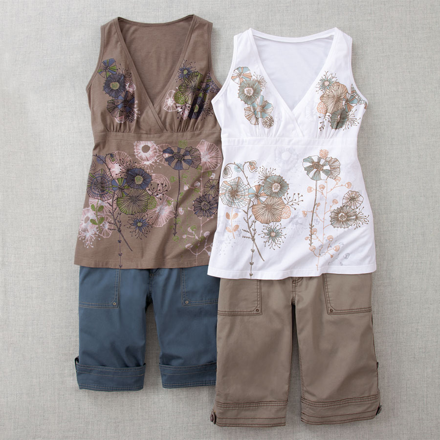 Time for sleeveless tops and shorts. High-waisted top has bra-friendly straps and roomy shape. Lightweight cotton-poly jersey, sizes XS(02), S(46), M(810), L(1214), XL(16), XXL(18). Shorts have pockets front and back, button fly, and twill ribbon detail. 13" inseam; to shorten, roll and button the legs. Organic cotton twill with a touch of spandex, sizes 216. All imported. Tank is relaxed fit; specify Latte or White. Shorts are semifitted; specify Latte or Indigo.