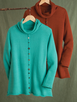 Nice and easy. Tunic-length cotton pullover sweater has a soft cowl neck and easy swing shape. Buttons and beads dance down the front. Hand-knit in Thailand by members of a women’s cooperative. Sizes XS/S(2–4), S/M(6–8), M/L(10–12), L/XL(14–16), 1X(18–20), 2X(20–22), 3X(22–24). Relaxed fit.