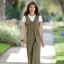 Unexpected angles and diagonal lines transform a vest into a statement. Rolled edges, carved coconut buttons, and mixed fabrics add to the fun. Pull-on cropped pants have a wide waist and hems with sassy back vents and buttons. Vest is preshrunk cotton blend jersey and slub jersey; pants are cotton jersey-spandex. Sizes XS(2-4), S(6-8), M(10-12), L(14-16), XL(16-18). Imported. Vest is relaxed fit, pants are semifitted.