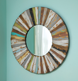 Wood slats of different colors and thicknesses, weathered and peeling, give this an aged, well-loved look, like it’s been in your family for years. Beveled mirror is 15" diameter; overall size 32". No rush delivery. Ships to 48 contiguous states only. ($10.00 additional shipping)