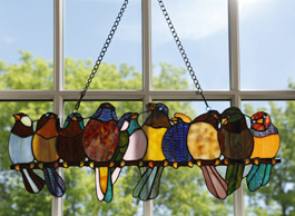 Ten colorful birds crowd together, as birds do. Lit by a sunbeam, they glow like little jewels. Crafted in Tiffany style, stained glass panel features 142 individual pieces of glass and 14 cabochons joined with copper foil. Hanging