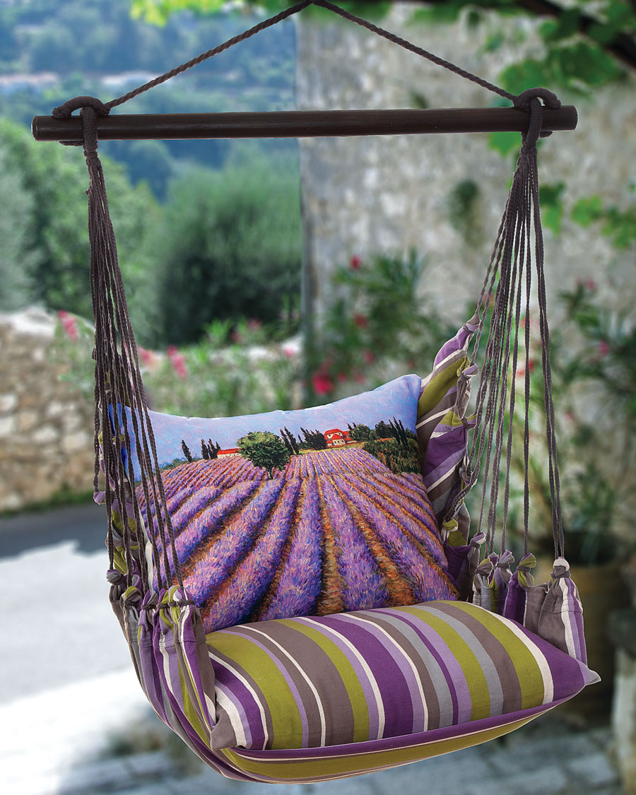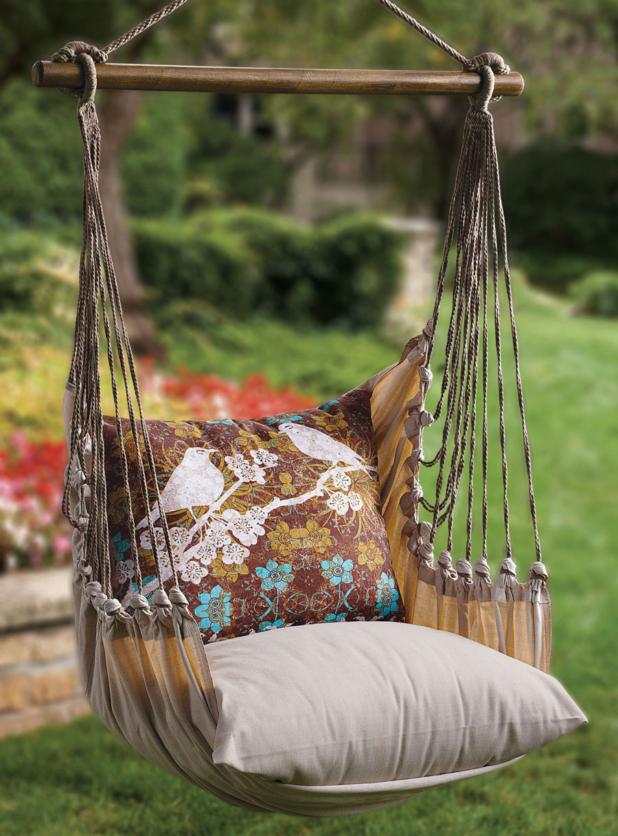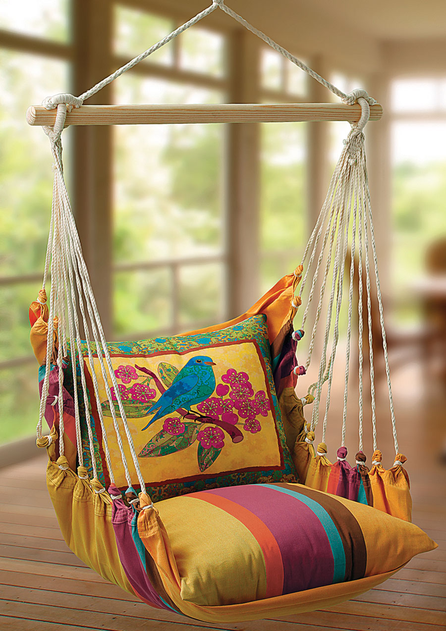 Sink in and take it easy. This plump, weather-resistant, easy-care chair is inviting indoors or out—in a porch or sunroom, hanging from a garden arbor beam or swing frame. The colorful bird design is by New Hampshire artist Tim Coffey; the cushions are polyfill with zip-off Sundure covers. Bottom cushion 22" square; back cushion 22" x 17". Hanging hardware (not included) is available at any hardware store. Allow 2 weeks. No rush delivery. Ships to 48 contiguous states only. ($10.00 additional shipping)