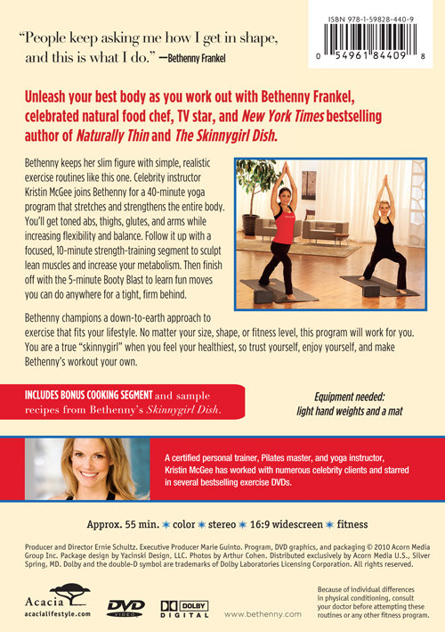 Unleash your inner skinnygirl with help from Bethenny Frankel, star of The Real Housewives of New York City, natural food chef, and New York Times best-selling author. Celebrity instructor Kristin McGee joins Frankel for a yoga and strength training program that stretches, tones, sculpts, and energizes. Matter-of-fact, down-to earth, and fun, this program is for everyone regardless of size, shape, or fitness level. Includes bonus cooking segment and sample recipes. Requires light hand weights and mat. Approx. 55 min. on 1 DVD.