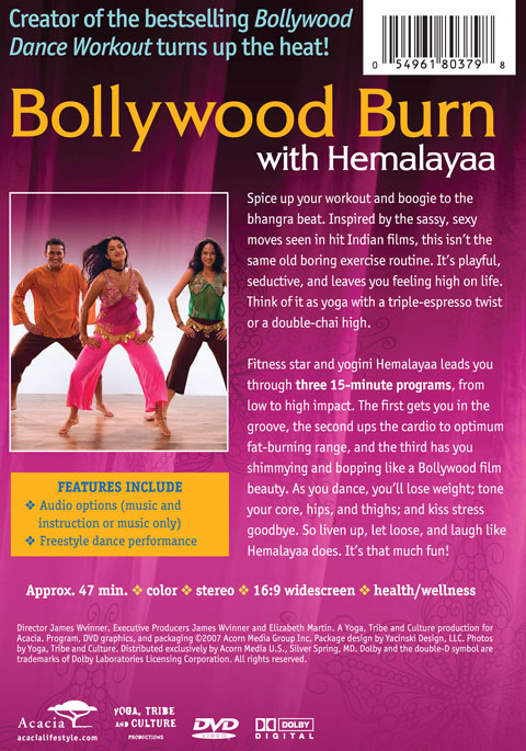 Get fit with Bollywood dance moves and infectious bhangra beats. Known for her playful spirit, fitness star and yogini Hemalayaa leads sexy, sassy, fun workouts that burn fat and tone your whole body. Bollywood Burn features three sizzling 15-minute programs. The first gets you in the groove, the second ups the cardio to optimum fat-burning range, and the third has you bopping like a Bollywood film beauty. Tone your core, hips, and thighs, lose weight, dance away stress, and have fun. 47 min. on 1 DVD.