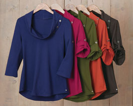 Our best-selling tee, with smart new touches: pleats and buttons on the soft cowl neck, twill tabs and buttons on the 3/4-length roll-up sleeves. Cotton jersey with a bit of spandex, sizes XS(24), S(68), M(1012), L(1416), XL(1618), 1X(1820), 2X(2022), 3X(2224). Machine wash. Imported. Semifitted. Specify Cocoa, Orange, Green, Red, or Royal Blue.