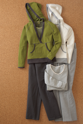 topstitching, and kangaroo pocket. Hangs 23" from shoulders. Long-sleeved scoop-neck tee has vertical stripes for nautical flair. Hangs 27"—below the pullover, by design. Pull-on pants have a wide elastic waist with hidden drawstring, side pockets, two back pockets, and back yoke detail. Pullover and pants are 95/5 cotton spandex French terry; tee is garment-dyed 55/45 cotton-poly. All in sizes S(4-6), M(8–10), L(10–12), XL(14–16). Machine wash. Imported. All are relaxed fit.