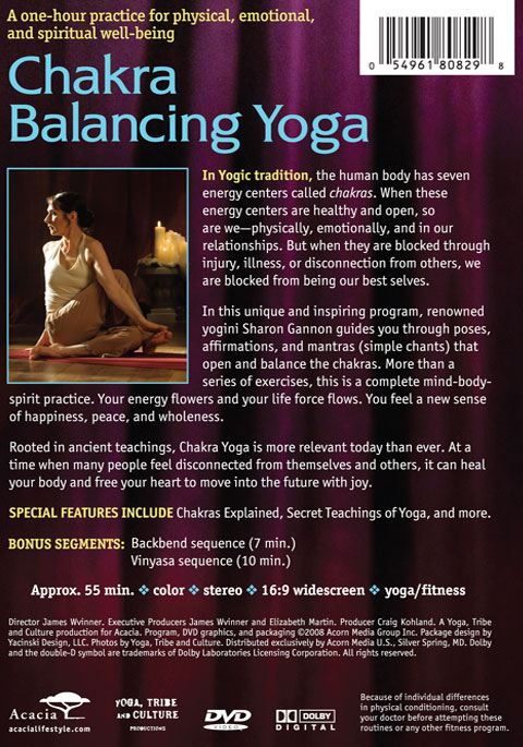 Calm your mind, energize your body, and bring balance into your life. Renowned yogini Sharon Gannon guides you through poses, affirmations, and mantras (simple chants) that open and balance the body’s energy centers (chakras). Much more than just exercise, it’s a mind-body-spirit practice that leads to a sense of peace and wholeness. Approx. 60 min. on 1 DVD.