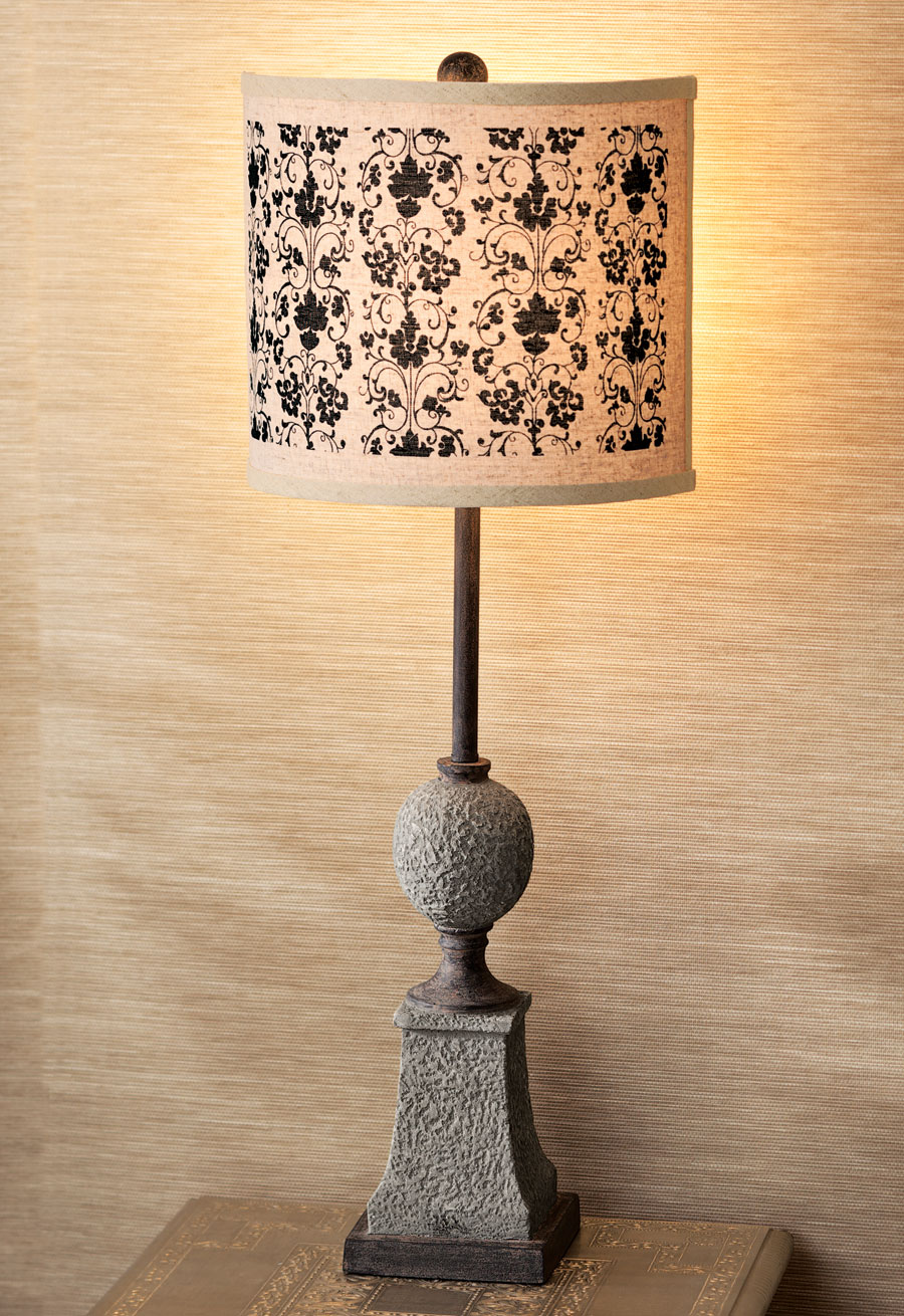 A French invention, the shield shade lets you use a larger lamp where a full shade wouldn’t fit—on a shallow table, for example, or a mantle. Lamp has a resin base with stone textured finish and fabric shade. Takes up to a 100-watt bulb. 3-way socket switch. 11"w x 7"d x 31"h. Simple assembly.