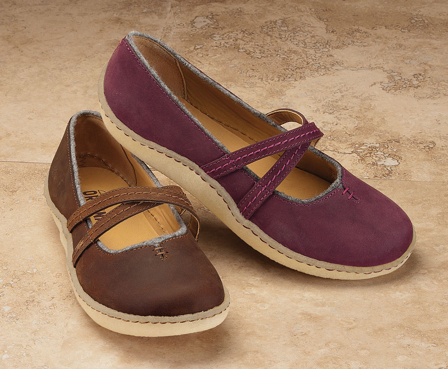 New best friends for your feet, these shoes have the features that made Clarks famous: full-grain leather uppers, grippy stitched crepe souls, roomy toe boxes. Crossover straps with a bit of elastic, collars with felted wool edges, and padded, supportive footbeds add up to all-day comfort. Whole and half sizes 6–9 ˝, whole sizes 10–11. Made by Clarks England. Imported. Specify Brown or Berry.