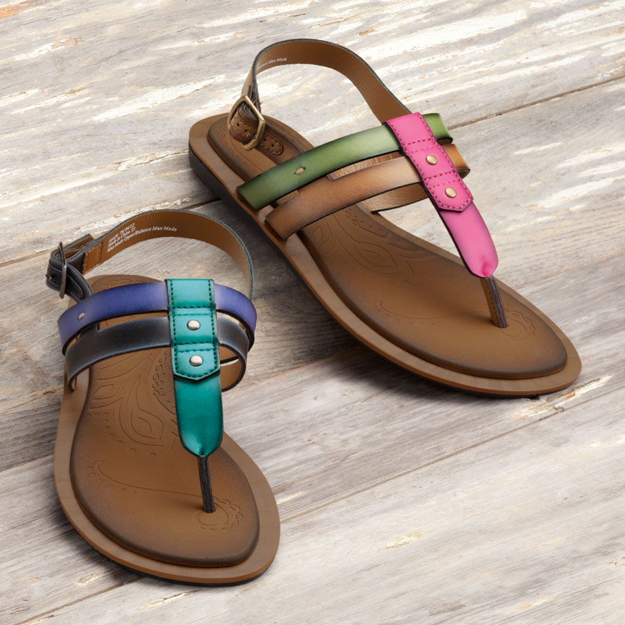Step up from flip-flops to these cute, comfy thong-style sandals. Uppers are faux leather, footbeds spongy-soft EVA, outsoles rubber. Adjustable heel straps, vibrant colors. Lightweight, flexible, shock-absorbing. Whole and half sizes 5 ˝–9, whole sizes 10–12. Imported. Made by Clarks England. Specify Teal or Pink.