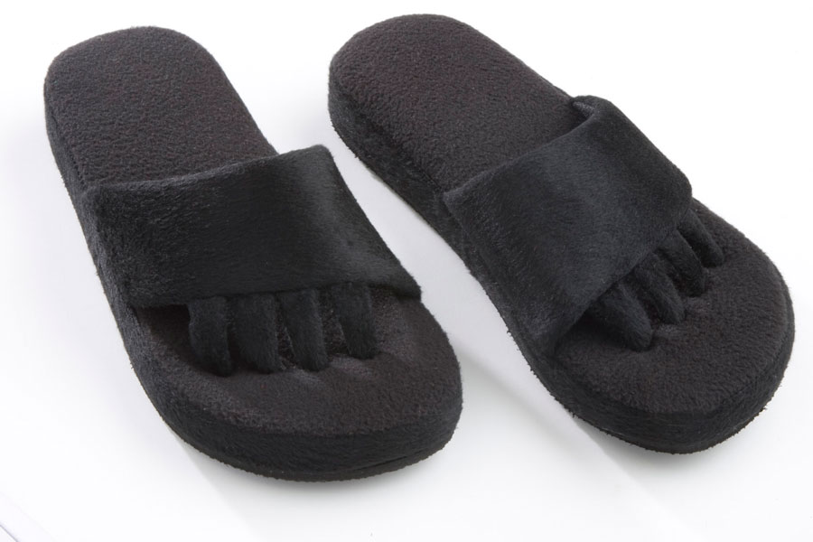 The dividers separate and stretch your toes; the sloping footbeds tone your foot muscles. These slippers strengthen your arches and improve your overall body alignment. Wear around the house or to the spa for pedicures. Pill-proof polyester fabric, EVA midsole and outsole.. Sizes S(4–5˝), M(6–7˝), L(8–9˝), XL(10–11˝). Imported. Choose leopard or black.