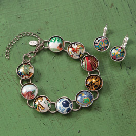 Jewelry with a scrumptious past. Each one of a kind piece is hand-formed from a vintage tin and set in silvertone metal. Bracelet adjusts 7 ˝"-9 ˝". Earrings hang about 1". Made by jewelry artist Tracy Stannard, in her Georgia studio.