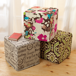 Sit or rest your feet on them. Put trays on the tops and use them as tables; bring them out when guests stop by. High-density foam wrapped in fabric, they're endlessly useful. Linen-blend Tea House, polyester Floral, or cotton-blend Ikat. 15" cubes. Made in USA. No rush delivery. Ships to 48 contiguous states only. ($5.00 additional shipping)