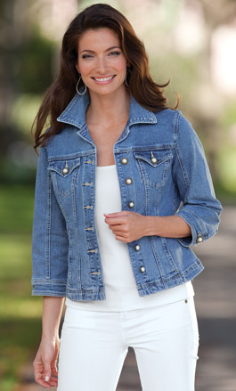A classic, bejeweled. Slightly stretchy cottonspandex jacket has girly curves, princess seams, on-seam pockets, and faux pearl buttons. The 3/4-length sleeves eliminate bulky rolled cuffs. Sizes S(4–6), M(8–10), L(12–14), XL(14–16), 1X (18–20), 2X (22–24), 3X (24–26). Imported. Semifitted.
