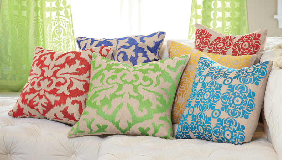 Timeless elegance in contemporary colors. Covers are cotton-linen blend with smooth satin-stitch embroidery and hidden zipper closures. Plump, cushy inserts are filled with feathers and down. Each 20" x 20". Dry-clean. Medallion (shown left): specify Red, Yellow, or Turquoise. Ikat (shown right): specify Red, Green, or Blue.
