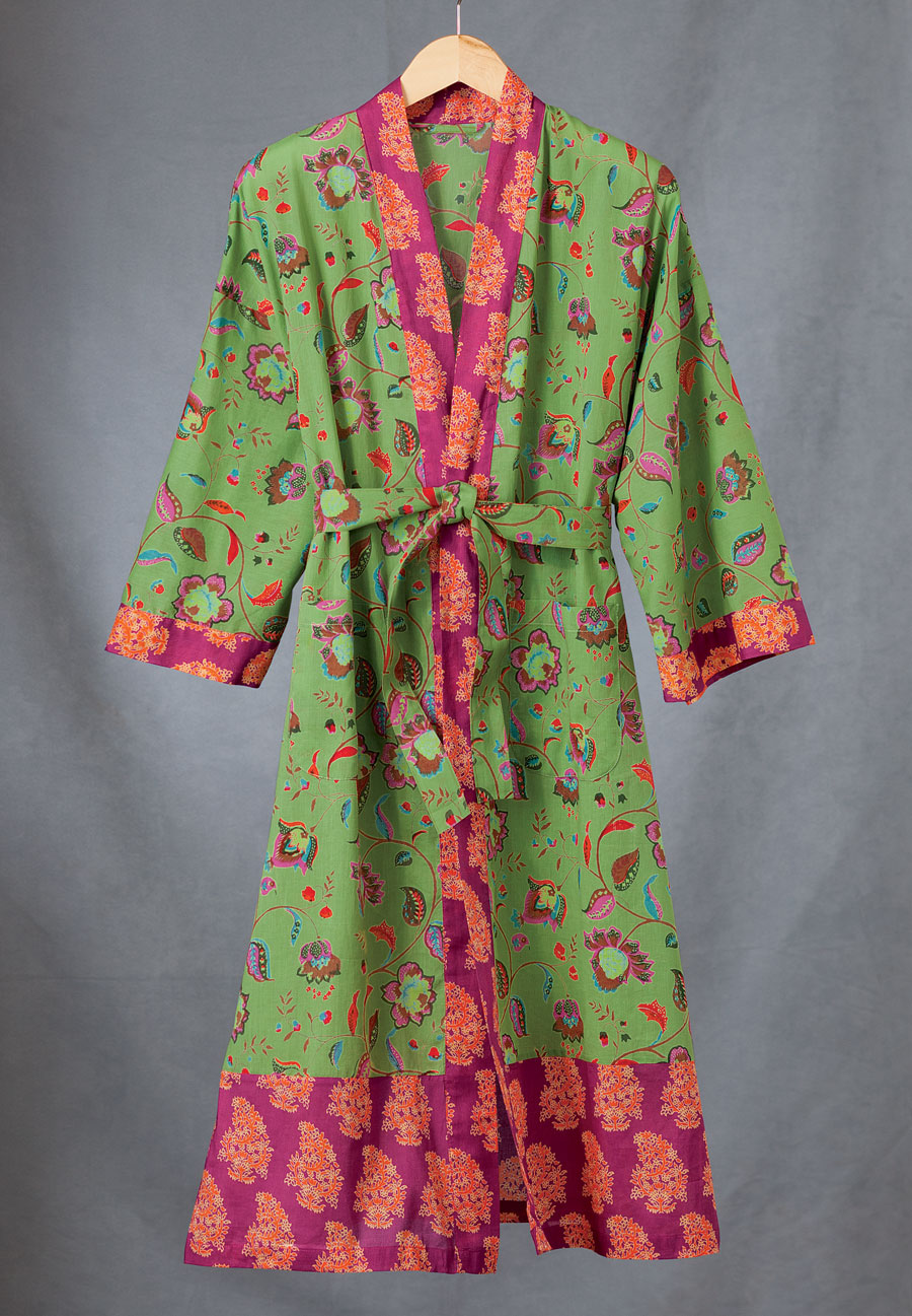 on green, edged with fuchsia. Robe has kimonostyle