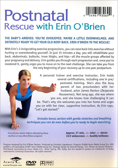Stay in shape while expecting; get your old body back after Baby arrives. Personal trainer Erin O’Brien is also the parent of two preschoolers with husband James Denton (Desperate Housewives). Postnatal Rescue features 3 invigorating progressions that ease you back into exercise, with results in just 15 minutes a day. Approx. 60 min. on 1 DVD.
