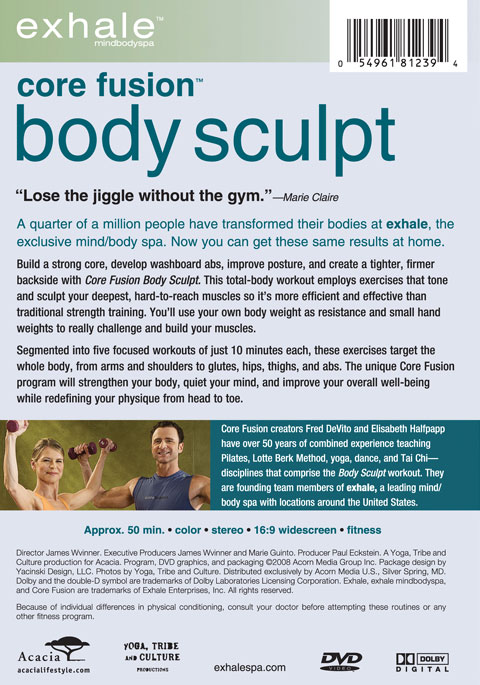 A quarter of a million people have transformed their bodies at exhale, the exclusive mind/body spa with locations around the US. Now you can get the same results at home with workouts from Core Fusion creators Fred DeVito and Elisabeth Halfpapp. Body Sculpt tones and sculpts your deepest, most hard-to-reach muscles so it’s more efficient and effective than traditional strength training. Using your own body weight as resistance, five 10-minute workouts build a strong core, develop washboard abs, give you better posture, and shape a tighter, firmer backside. To make the most of this program, you’ll need small hand weights. 50 min. on 1 DVD.