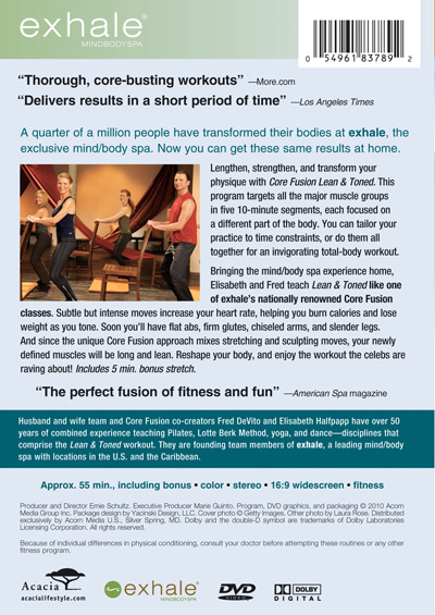 A quarter of a million people have transformed their bodies at exhale, the exclusive mind/body spa with locations around the US. Now you can get the same results at home with workouts from Core Fusion creators Fred DeVito and Elisabeth Halfpapp. Lean & Toned mixes stretching and sculpting moves to lengthen, strengthen, and reshape your physique. Each 10-minute segment focuses on a different part of the body. Soon you’ll have flat abs, firm glutes, chiseled arms, and slender legs. Because these moves increase your heart rate, you’ll burn calories and lose weight as you tone. 50 min. on 1 DVD.