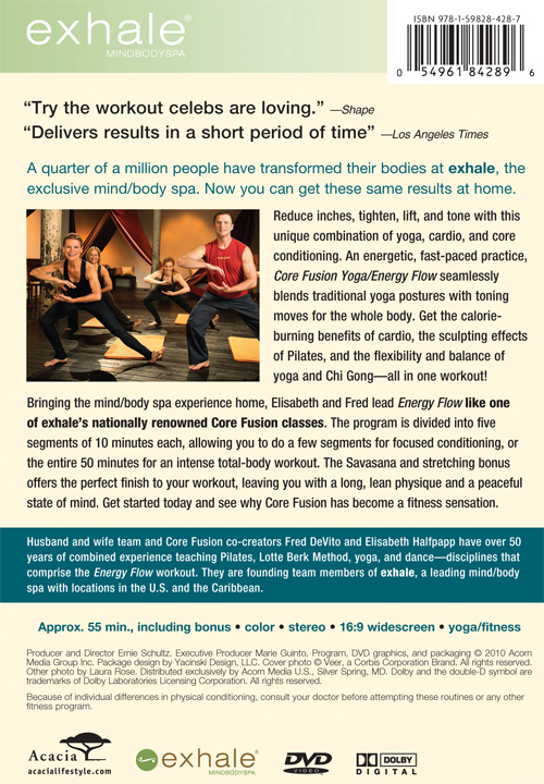 A quarter of a million people have transformed their bodies at exhale, the exclusive mind/body spa with locations around the US. Now you can get the same results at home with workouts from Core Fusion creators Fred DeVito and Elisabeth Halfpapp. Yoga Energy Flow blends traditional yoga postures with toning moves in a fast-paced, energetic practice. You get the calorie-burning benefits of cardio, the sculpting effects of Pilates, and the flexibility and balance of yoga and Chi Gong, all in one workout. Five 10-minute segments tighten, lift, and melt away inches while creating a peaceful state of mind. 50 min. on 1 DVD.