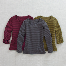 Traditional striped tees with a twist: bright, vibrant colors. Easy-fitting pull-on top has sleeves that go from long to ¾-length with button tabs. Cotton-poly blend, sizes S(6–8), M(10-12), L(14–16), XL(18). USA. Relaxed fit. Specify Citron, Slate, or Red.