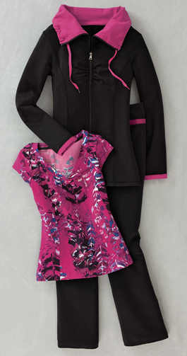 Hot pink, cool details. Jacket has a full zipper front and cowl drawstring neck to zip, cinch, or leave loose and open. Princess seams and shirring create a flattering fit. Pull-on pants have a fl at front and contoured waist.