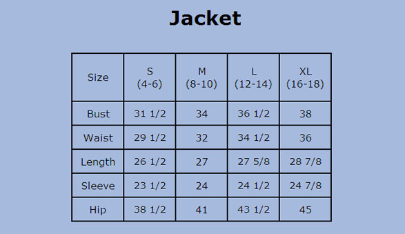 - Full zipper front, princess seams