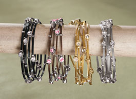 Fun and trendy for wearing, sharing, or giving. Real guitar strings are formed into bracelets, with crystals added for a bit of bling. Nylon-coated steel, silver-colored brass findings. One size fits most. Set of 5. Specify Black, Bronze, Gold, or Silver.