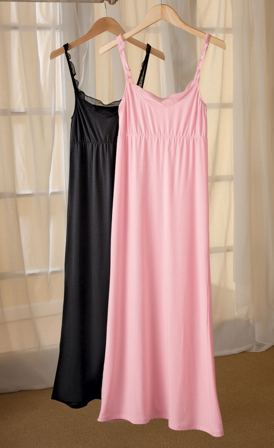 Stay cool and dry even when your temperature spikes. Empire-waist nightgown is moisture-wicking poly blend with adjustable straps and georgette trim. Poly chenille lounge jacket has a ruffled edge, open front, and 3/4-length sleeves. Sizes S(2–4), M(6–8), L(10–12), XL(14–16). Both relaxed fit. Imported. Specify Pink or Black.