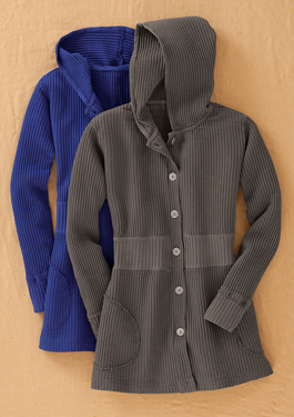 Its everything you want in a throw on- and-go piece: easy fit, endless comfort, stylish touches. Soft, stretchy lightweight hoodie hangs a bum-covering 30 (tunic length). Waffle cotton, garment-dyed and preshrunk, with silver metal buttons and raw-edge details. Sizes S(46), M(810), L(1214), XL(1416), 1X(1820), 2X(2022). Relaxed fit. Made in the USA.