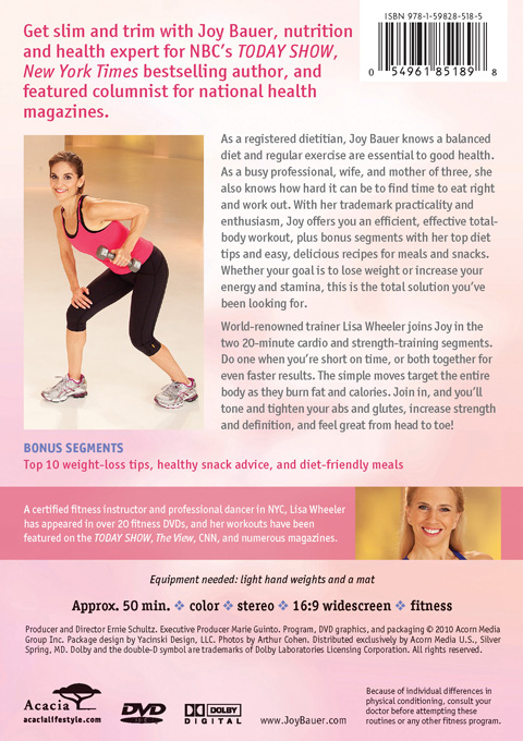 Nutrition expert for the NBC Today show, Joy stays slim, strong, and fit by exercising and eating sensibly. Her Slimdown Workout with trainer Lisa Wheeler combines cardio and strength training to target the entire body. Two 20-minute segments tone and tighten abs and glutes, increase strength and definition, and burn fat and calories. Feel better from head to toe. 50 min. on 1 DVD.