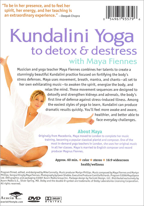 Kundalini is among the easiest yoga styles to learn. One of London’s most in-demand yoga teachers, Maya Fiennes blends movement, breath, mantra, and chants (all set to her own exhilarating music) in Kundalini sequences designed to detoxify and strengthen kidneys and adrenals-the body's first line of defense against stress-induced illness. You'll feel more awake and aware, healthier, and better able to face everyday challenges. Exclusive bonus CD includes more of Maya’s music. “To feel her spirit, her energy, and her teaching is an extraordinary experience”—Deepak Chopra, M.D. Approx. 60 min. on 1 DVD.