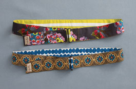 Add color and shape without bulge or bulk. Fabric belts have contrasting linings and low-profi le metal buckles. Floral (on gray) is 100% cotton, Medallions (on gold) is polyester and cotton. Sizes S (maximum 40"), M (44"), L (48"), XL (52"). Hand wash. Made in the USA. Specify Floral or Medallions.