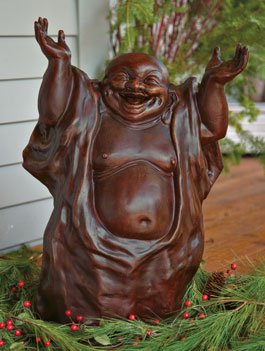 One of the seven lucky gods of Japan, the Laughing Buddha is the god of happiness, contentment, abundance, and wealth. It’s said that when you need a little luck, all you have to do is rub his big, round belly. Cast resin with a weathered brown finish. Two sizes: small (12"w x 16"h x 7"d) and large (16"w x 23"h x 10"d). No rush delivery. Ships to 48 contiguous states only.  ($10.00 additional shipping on large)