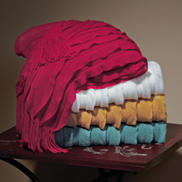 Soft and fluffy, lightweight yet cozy. Rows of layers, fringed on both ends. What’s not to love? Pure polyester, 50"x 60". Imported. Specify Ivory, Red, Gold, or Sea Green.