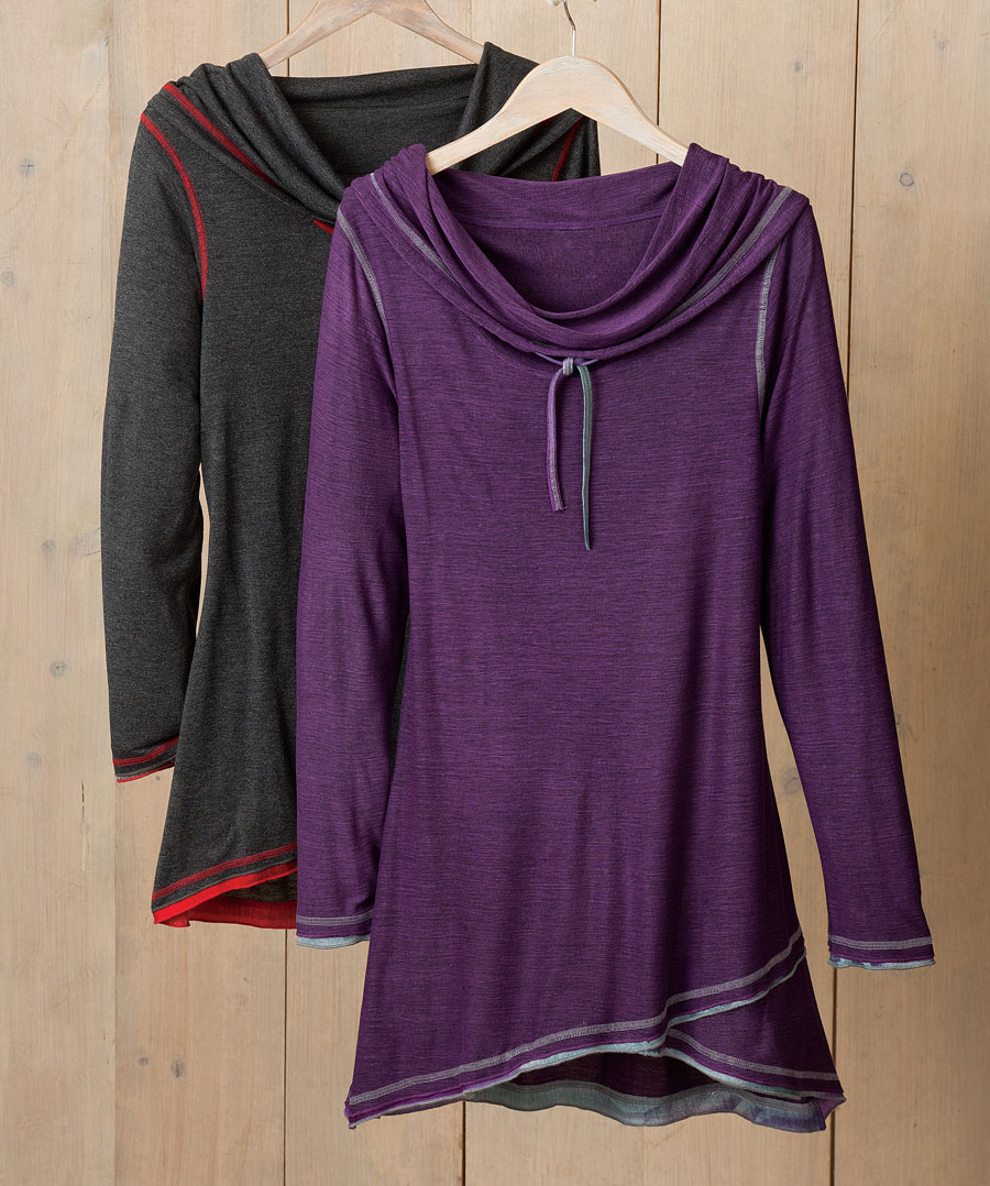 Flattering in every way. Contrasting double edges and stitching highlight the crossover hem and sleeve ends; the cowl adjusts with a tug of the ties. 100% rayon. Semifitted. Imported. Charcoal, Purple, Denim Blue. S(4.6), M(8.10), L(12.14), XL(16), 1X(16.18), 2X(20.22), 3X(22.24).