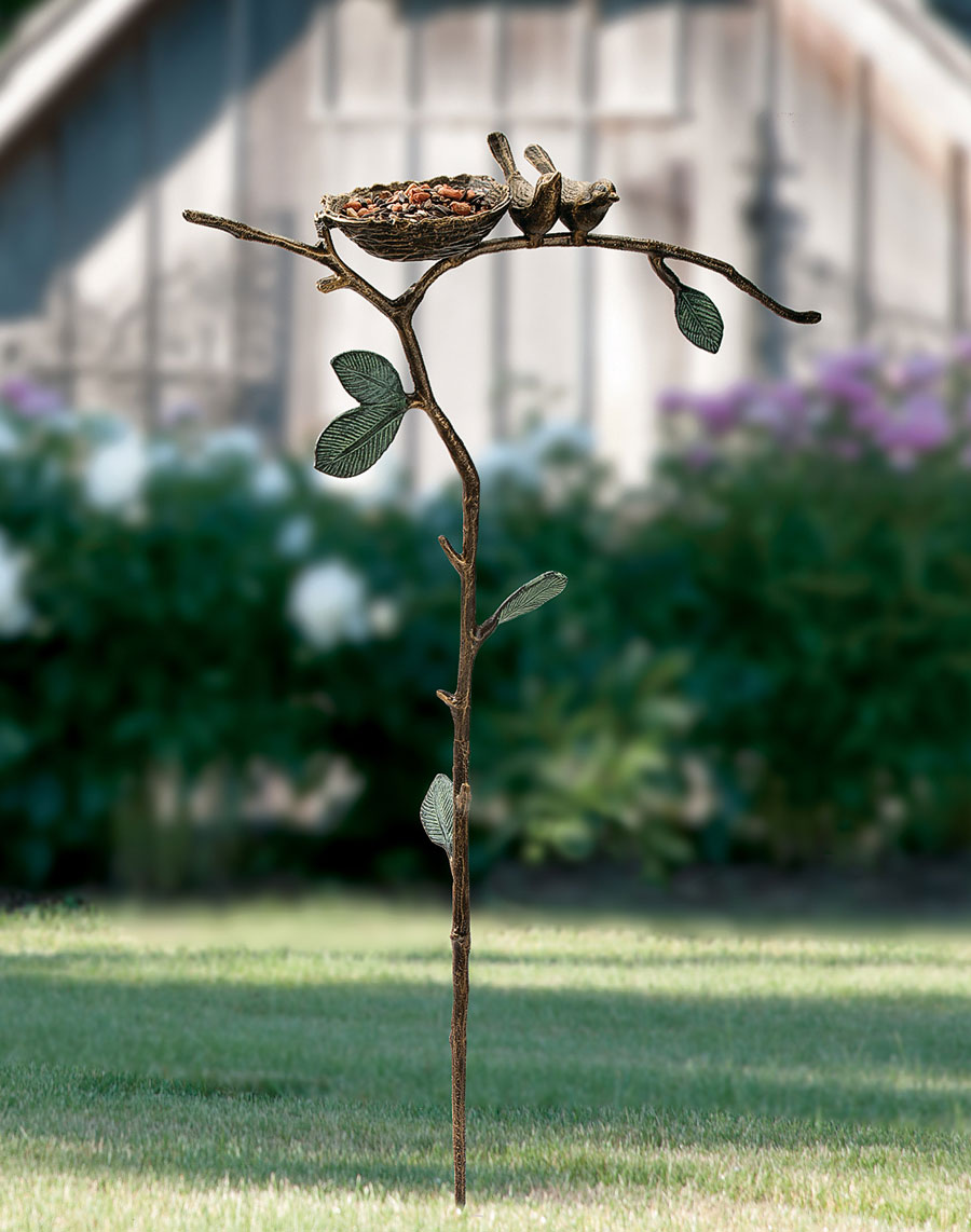 Stake it into the ground, fill the nest with seed, and watch the birds come. Handpainted, powder-coated cast aluminum feeder is weather-resistant and may be left outdoors year-round. 18" wide, 33" high.