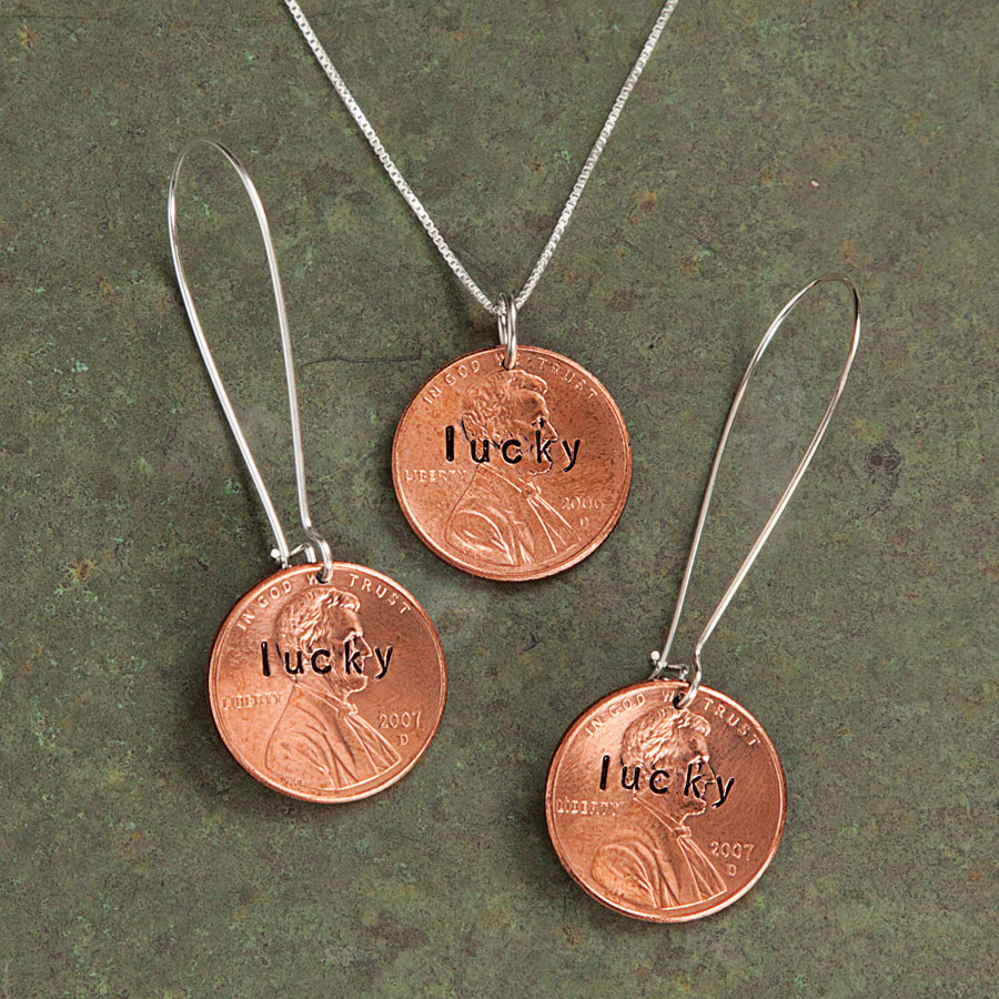 Share the luck of finding a penny. Stamped with “lucky,” necklace comes on an 18" sterling silver box chain, earrings 2" silver-plated wires. Made in the USA.