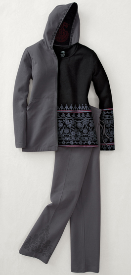 Casual wear goes global with printed and embroidered designs borrowed from mehndi (henna tattoos). Jacket has a double zipper (opens from top or bottom), kangaroo pockets, and lined hood. Long-sleeved top has elaborate prints and side slits. Straightleg pants have an elastic drawstring waist and mehndi accent on the right leg. Cotton jersey with a touch of spandex. Sizes XS(24), S(68), M(1012), L(1416), XL(1820). Imported. Relaxed fit.