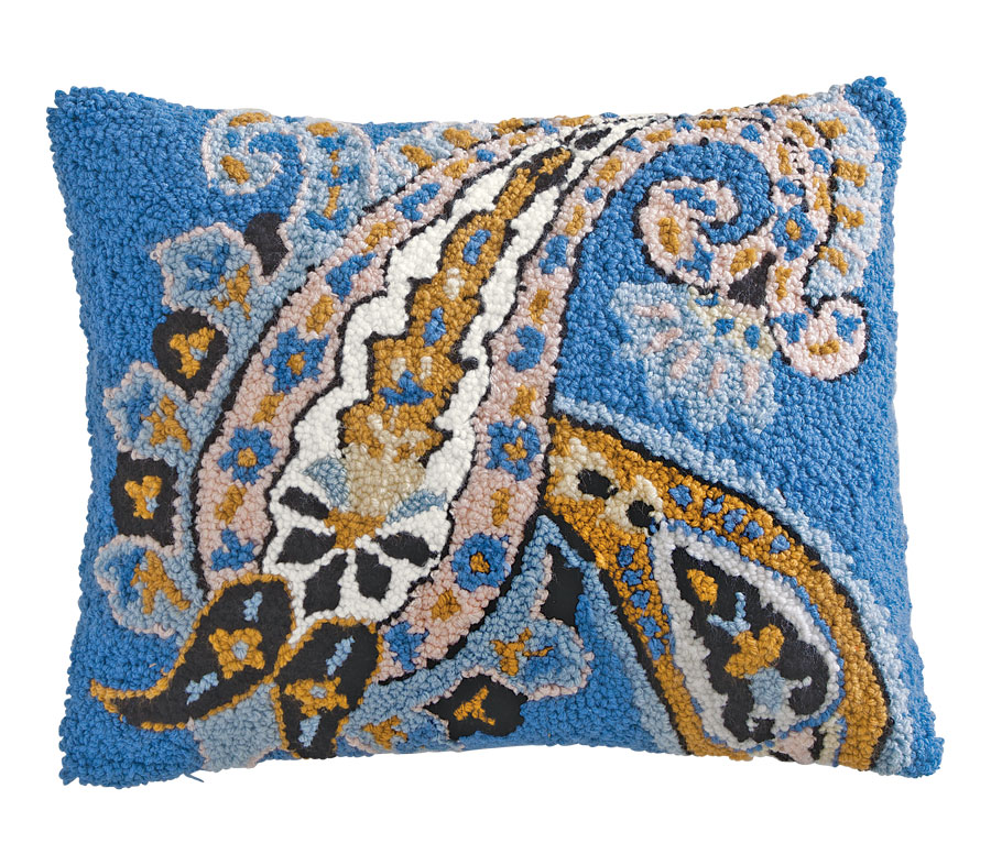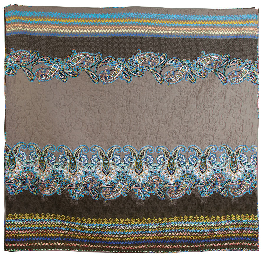 Deep, rich colors and exotic prints make a majestic bed. Mocha with paisley and tapestry designs reverses to a blue-and-gold lattice. Quilt is 100% cotton with cotton-poly fill; sham is 100% cotton. Accent pillows have removable cotton covers and polyfi ll inserts. Ikat-inspired Embroidered Pillow is 24" x 12"; Paisley Hooked Pillow is 18" x 14". Sham has a zipper closure. Machine wash and spot clean. Imported.