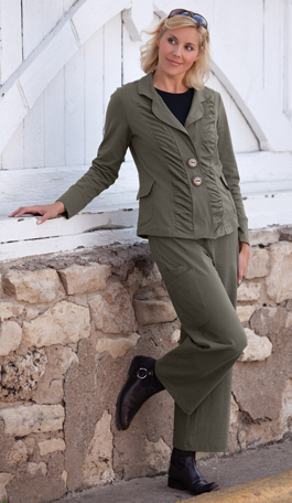 Stylish work-to-weekend wear, with wonderful details: ruching, interesting buttons, pockets in surprising places. Jacket has front and back princess seams; ankle pants look great with flats, heels, or boots. Preshrunk 4-way stretch cotton jersey holds its shape. Sizes XS(24), S(68), M(1012), L(1416), XL(1618), 1X(1820), 2X(2022), 3X(2224). Imported. Semifitted.