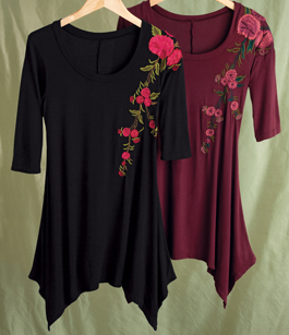 Soft, drapey, gloriously embroidered across the front, over the shoulder, and a bit down the back. The flowing hem hangs longer on the sides. Lightweight viscose-Lycra jersey knit, sizes S(24), M(68), L(1012), XL(1214). Imported. Relaxed fit.