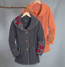 Soft, flattering, versatile, and warm, this jacket will take you through fall into winter and out the other side. Cozy fleece is embellished with appliquéd and embroidered velvet blooms with beaded centers; blanket stitching accents the edges. Jacket has raglan sleeves, shawl collar, pockets, and coconut buttons. 100% polyester (70% recycled), fully lined. Sizes XS(2–4), S(6–8), M(10–12), L(14–16), XL(18). Hangs 30" from shoulders. Machine wash. Imported. Relaxed fit—roomy enough to wear over a sweater. Made for Acacia.
