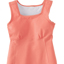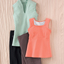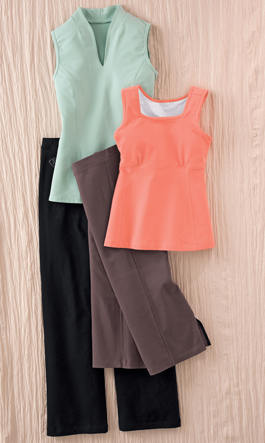 Workout musts to mix-and-match. Peach tank has an empire waist with vertical gathers and built-in, quick-dry wrap-around bra; celery tank has princess seams. Mocha
