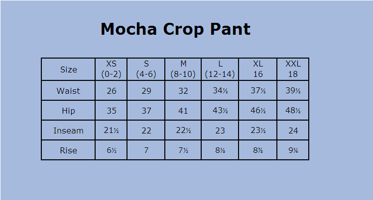 cropped pants and black full-length pants have a slightly dropped V-waist for comfort. All are organic cotton and spandex, sizes XS(0–2), S(4–6), M(8–10), L(12–14), XL(16), XXL(18). Made in the USA. Fitted.