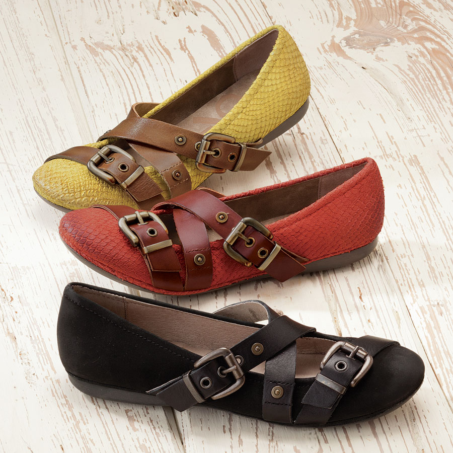 Because shoes can’t have too many straps. Spirited ballet flats have nubuck uppers, leather linings, foam-cushioned footbeds, and grippy rubber soles. Red and Yellow are snakeskin-textured with oiled toes—the latest look. Black are classic smooth leather. Whole and half sizes 6–9 ˝, whole sizes 10–11. From Off the Beaten Track. Imported. Specify Black, Red, or Yellow.