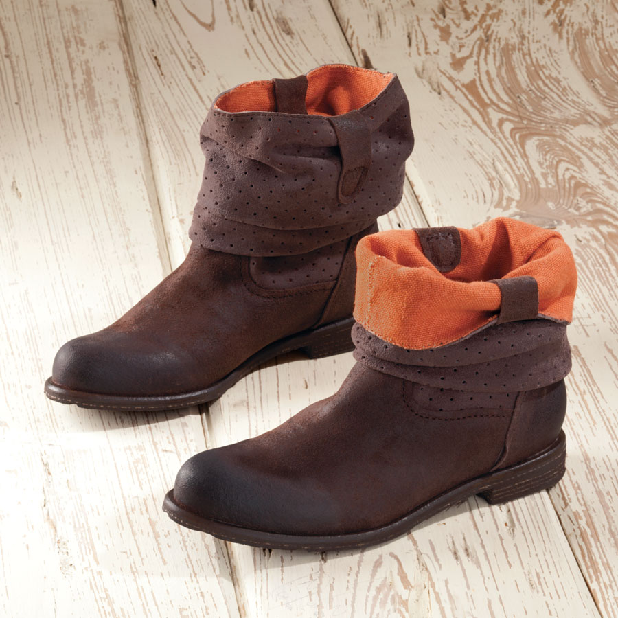 Just in time for spring: boots that breathe. Leather uppers have trendy oiled toes and slouchy perforated shafts. Lined in orange fabric, finished with pull-on tabs, cushioned footbeds, and grippy rubber tire-tread soles. 8" shafts, 1" heels. Whole and half sizes 6–9 ˝, whole sizes 10–11. Imported. From Off the Beaten Track.