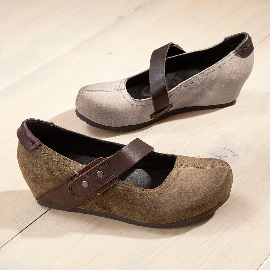 A new look for wedges: sleek and sculpted. Suede uppers and suede-wrapped 1" heels, diagonal Mary Jane straps with Velcro, molded footbeds, rubber outsoles. Whole and half sizes 5 ˝–9 ˝, whole sizes 10–11. From Off the Beaten Track. Imported. Specify Brown or Stone.