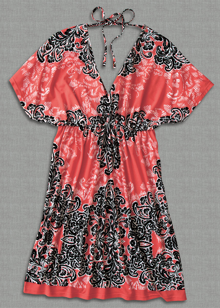 perfect over leggings. Tunic has a V-neck front and back, high elastic waist, and back ties at the neck. You might also wear it as a short dress or beach cover-up. Poly-elastane, sizes S(2–4), M(6–8), L(10–12), XL(14). Hand wash. Imported. Relaxed fit.